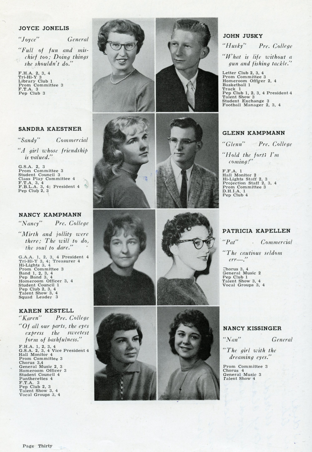 1960 Plymouth High School, Page 30: Joyce Jonelis, John Jusky, Sandra Kaestner, Glenn Kampmann, Nancy Kampmann, Patricia Kapellen, Karen Kestell, Nancy Kissinger.