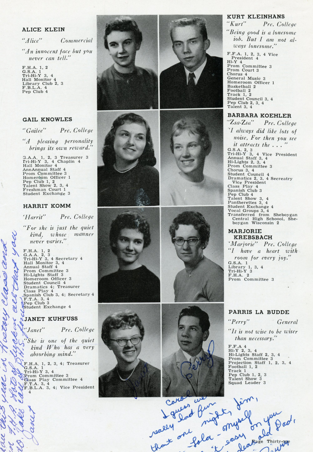 1960 Plymouth High School, Page 31: Alice Klein, Kurt Kleinhans, Gail Knowles, Barbara Koehler, Harrit Komm, Marjorie Krebsbach, Janet Kuhfuss, Parris La Budde.