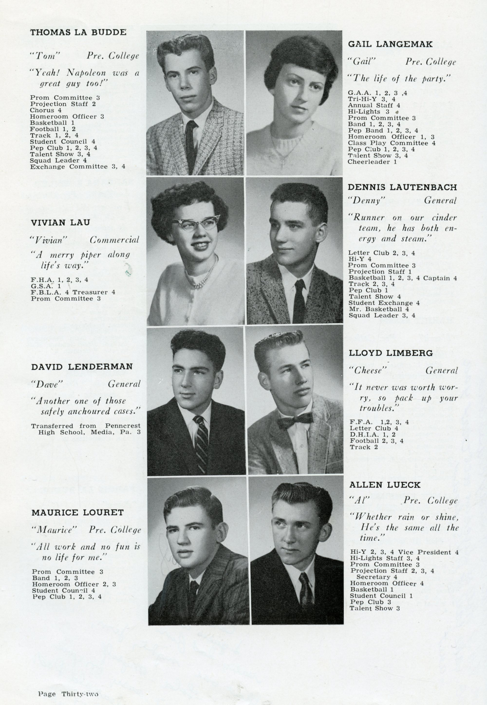 1960 Plymouth High School, Page 32: Thomas La Budde, Gail Langemak, Vivian Lau, Dennis Lautenbach, David Lenderman, Lloyd Limberg, Maurice Louret, Allen Lueck.