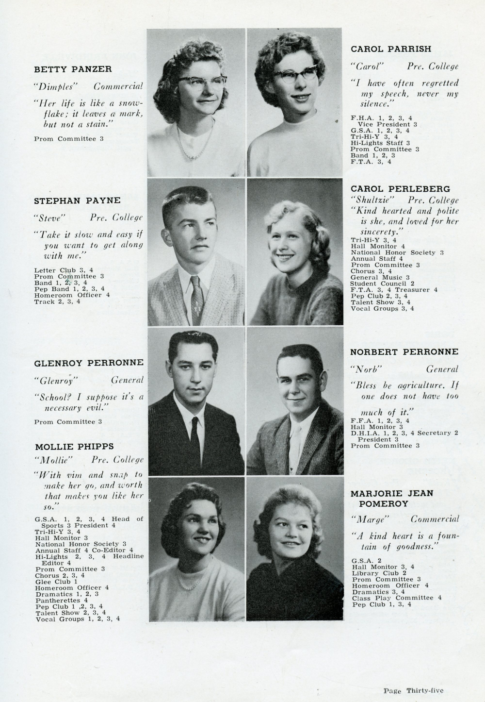 1960 Plymouth High School, Page 35: Betty Panzer, Carol Parrish, Stephan Payne, Carol Perleberg, Glenroy Perronne, Norbert Perronne, Mollie Phipps, Marjorie Jean Pomeroy.