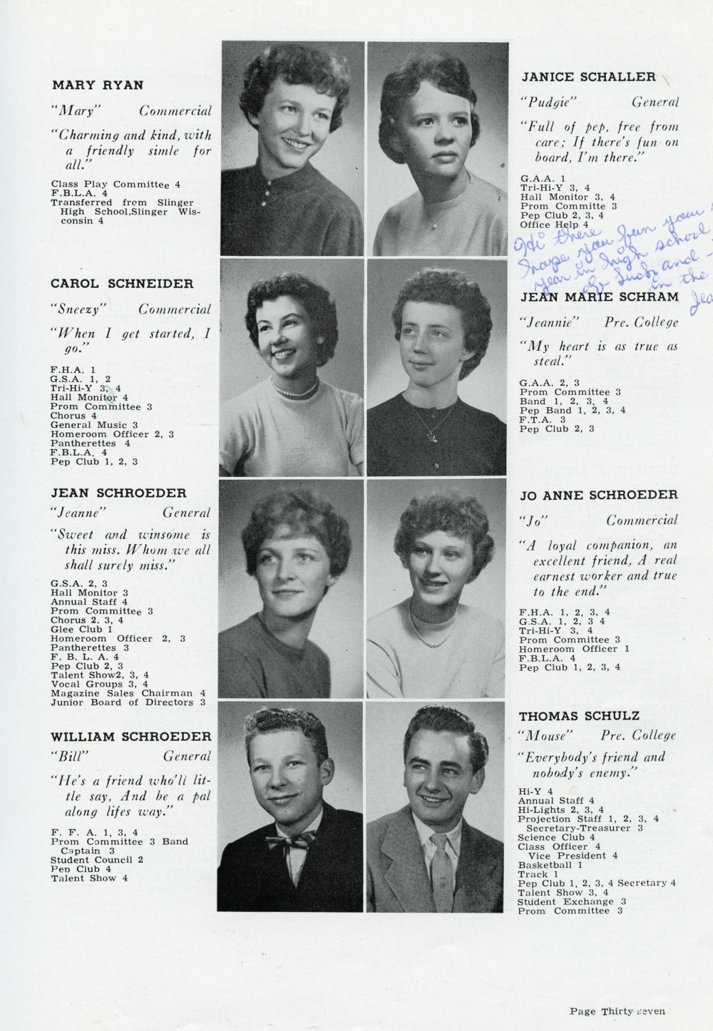 1960 Plymouth High School, Page 37: Mary Ryan, Janice Schaller, Carol Schneider, Jean Marie Schram, Jean Schroeder, Jo Ann Schroeder, William Schroeder, Thomas Schulz.