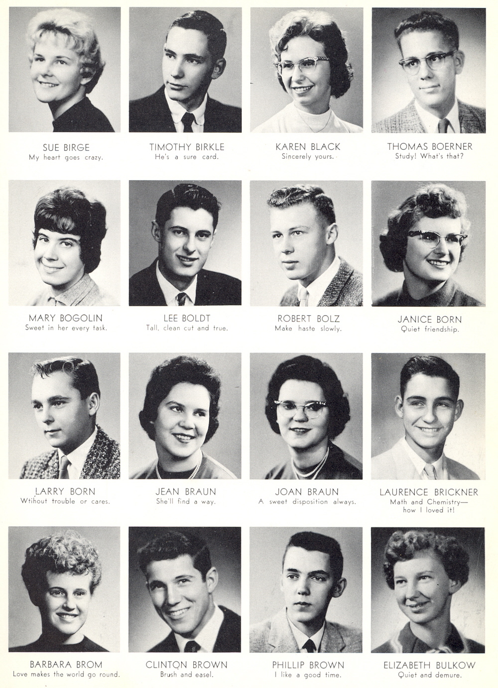 1960 Sheboygan Central High School, Page 23: Sue Birge, Timothy Birkle, Karen Black, Thomas Boerner, Mary Bogolin, Lee Boldt, Robert Bolz, Janice Born, Larry Born, Jean Braun, Joan Braun, Laurence Brickner, Barbara Brom, Clinton Brown, Phillip Brown, Elizabeth Bulkow.