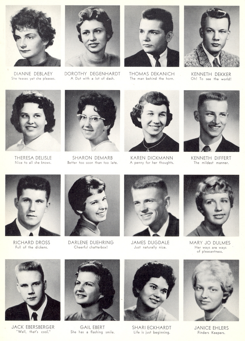 1960 Sheboygan Central High School, Page 24: Dianne Deblaey, Dorothy Degenhardt, Thomas Dekanich, Kenneth Dekker, Theresa Delisle, Sharon Demarb, Karen Dickmann, Kenneth Differt, Richard Dross, Darlene Duehring, James Dugdale, Mary Jo Dulmes, Jack Ebersberger, Gail Ebert, Shari Eckhardt, Janice Ehlers.
