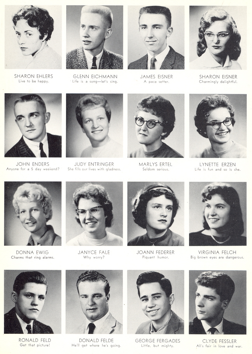 1960 Sheboygan Central High School, Page 26: Sharon Ehlers, Glenn Eichmann, James Eisner, Sharon Eisner, John Enders, Judy Entringer, Marlys Ertel, Lynette Erzen, Donna Ewig, Janyce Fale, Joann Federer, Virginia Felch, Ronald Feld, Donald Felde, George Fergades, Clyde Fessler.