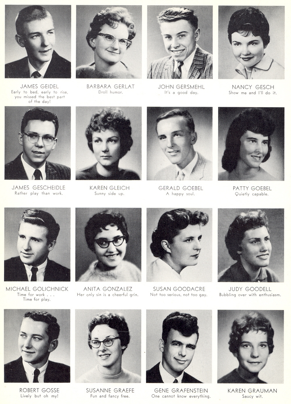 1960 Sheboygan Central High School, Page 28: James Geidel, Barbara Gerlat, John Gersmehl, Nancy Gesch, James Gescheidle, Karen Gleich, Gerald Goebel, Patty Goebel, Michael Golichnick, Anita Gonzalez, Susan Goodacre, Judy Goodell, Robert Gosse, Susanne Graefe, Gene Grafenstein, Karen Grauman.