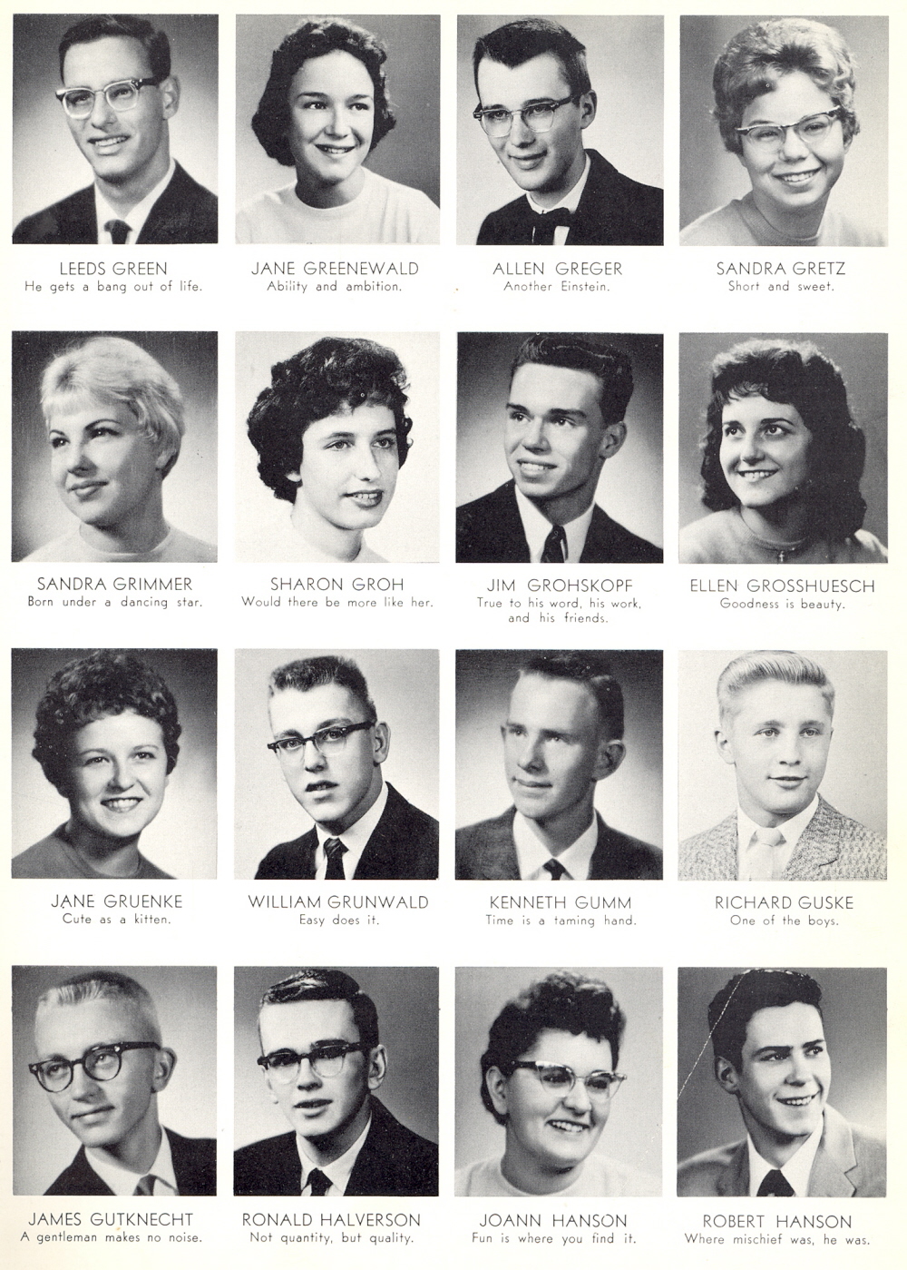 1960 Sheboygan Central High School, Page 29: Leeds Green, Jane Greenewald, Allen Greger, Sandra Gretz, Sandra Grimmer, Sharon Groh, Jim Grohskopf, Ellen Grosshuesch, Jane Gruenke, William Grunwald, Kenneth Gumm, Richard Guske, James Gutknecht, Ronald Halverson, Joann Hanson, Robert Hanson.