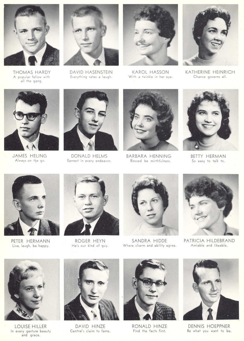 1960 Sheboygan Central High School, Page 30: Thomas Hardy, David Hasenstein, Karol Hasson, Katherine Heinrich, James Heling, Donald Helms, Barbara Henning, Betty Herman, Peter Hermann, Roger Heyn, Sandra Hidde, Patricia Hildebrand, Louise Hiller, David Hinze, Romand Hinze, Dennis Hoeppner.