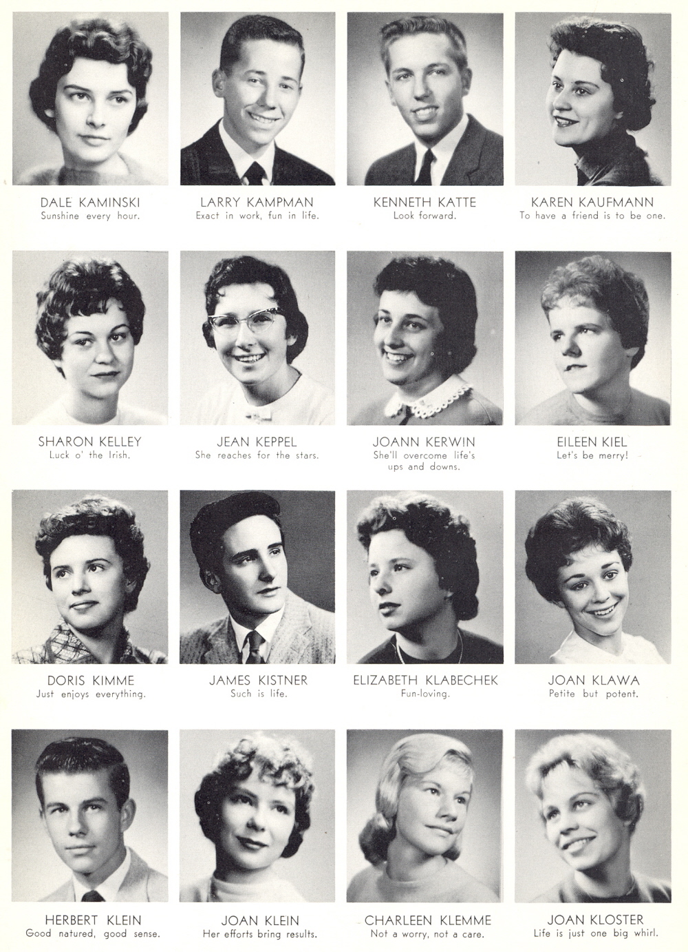 1960 Sheboygan Central High School, Page 32: Dale Kaminski, Larry Kampman, Kenneth Katte, Karen Kaufmann, Sharon Kelley, Jean Keppel, Jo Ann Kerwin, Eileen Kiel, Doris Kimme, James Kistner, Elizabeth Klabechek, Joan Klawa, Herbert Klein, Joan Klein, Charleen Klemme, Joan Kloster.