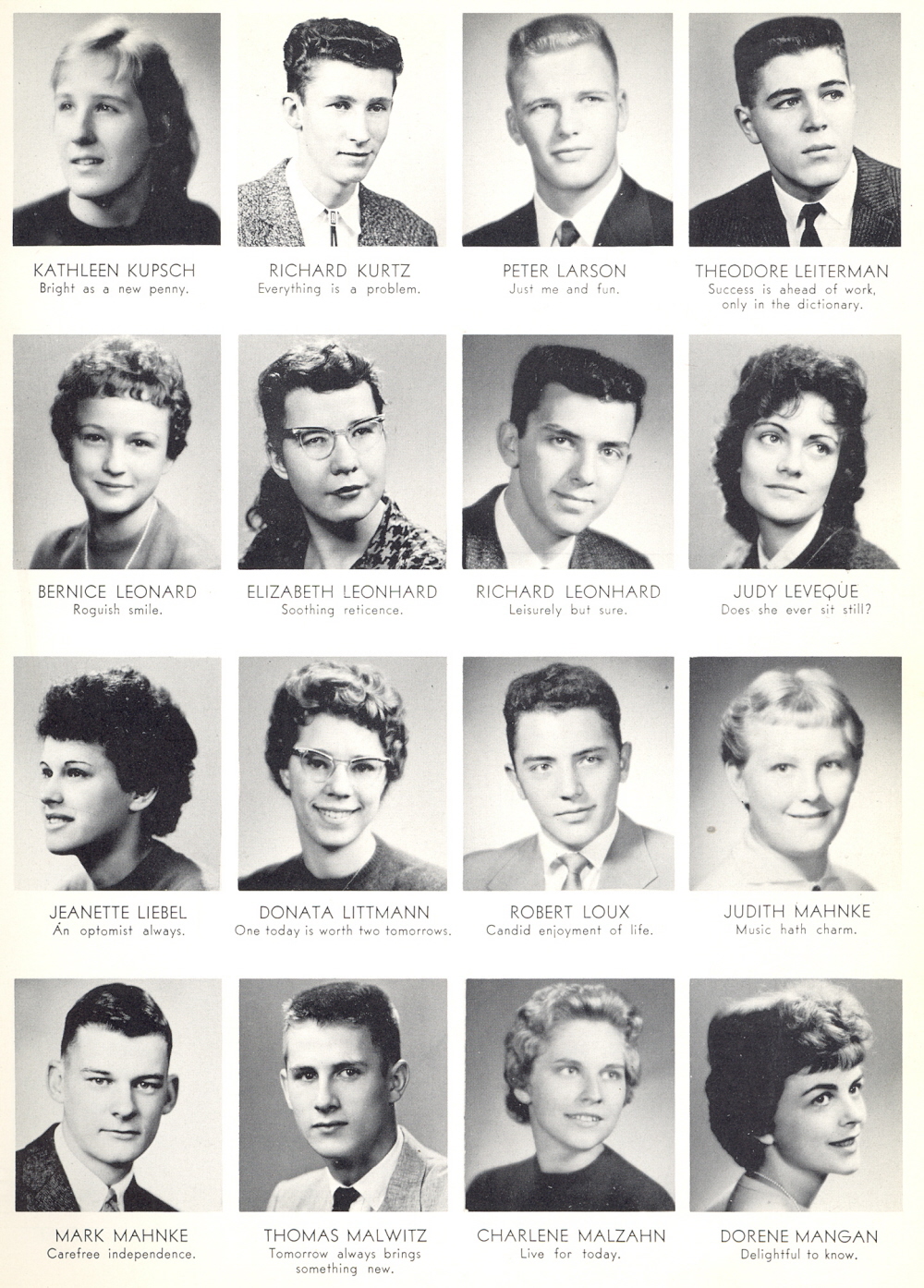 1960 Sheboygan Central High School, Page 35: Kathleen Kupsch, Richard Kurtz, Peter Larson, Theodore Leiterman, Bernice Leonard, Elizabeth Leonhard, Richard Leonhard, Judy Leveque, Jeanette Liebel, Donata Littmann, Robert Loux, Judith Mahnke, Mark Mahnke, Thomas Malwitz, Charlene Malzahn, Dorene Mangan.