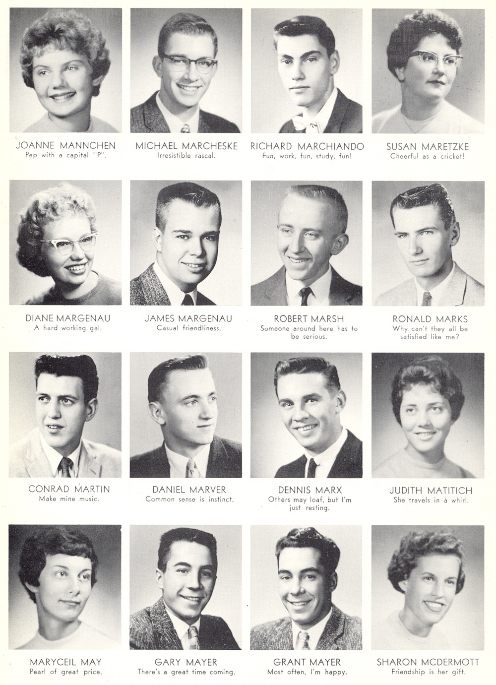 1960 Sheboygan Central High School, Page 36: Joanne Mannchen, Michael Marcheske, Richard Marchiando, Susan Maretzke, Diane Margenau, James Margenau, Robert Marsh, Ronald Marks, Conrad Martin, Daniel Marver, Dennis Marx, Judith Matitich, Maryceil May, Gary Mayer, Grant Mayer, Sharon McDermott.