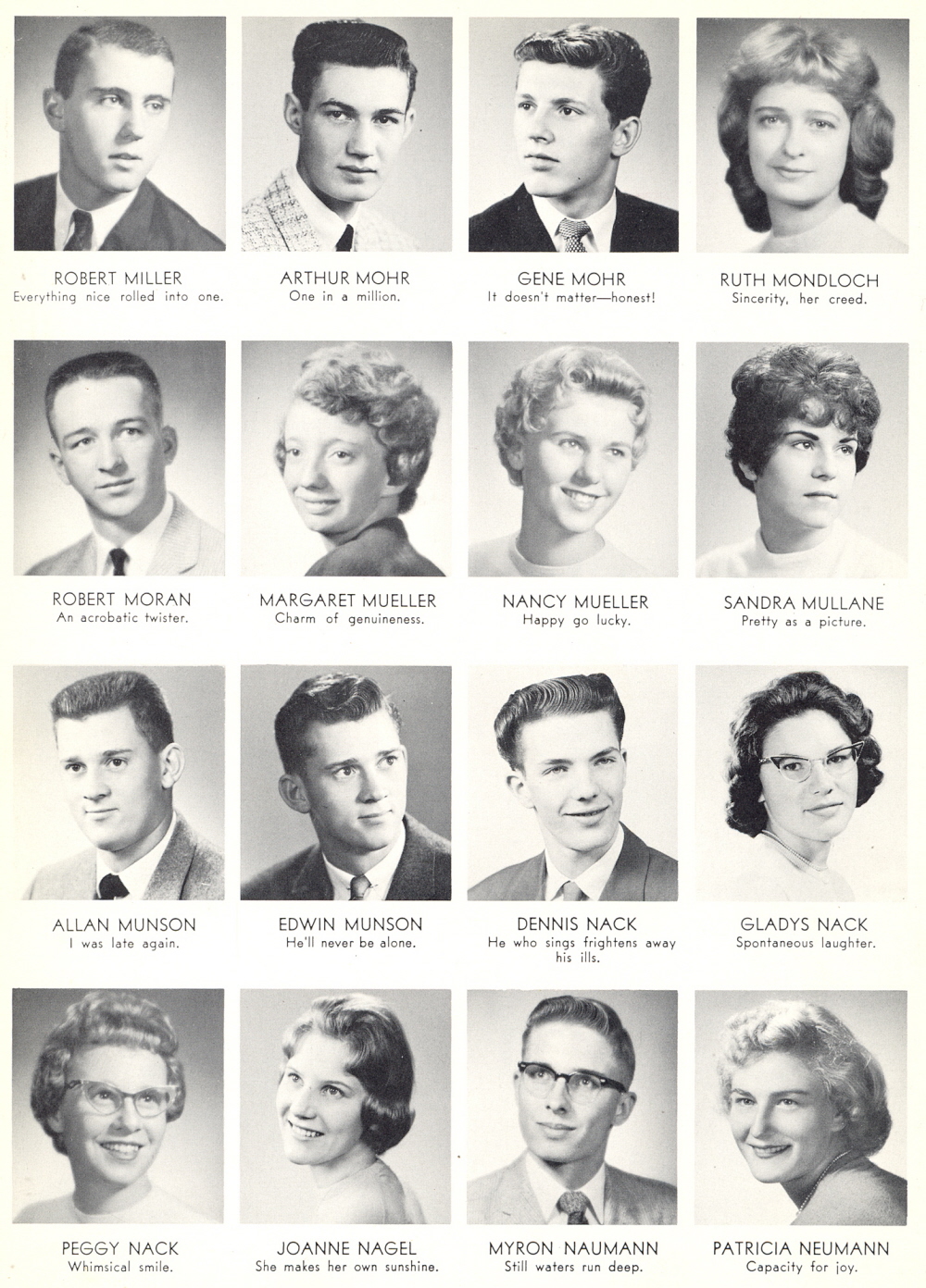 1960 Sheboygan Central High School, Page 38: Robert Miller, Arthur Mohr, Gene Mohr, Ruth Mondloch, Robert Moran, Margaret Mueller, Nancy Mueller, Sandra Mullane, Allan Munson, Edwin Munson, Dennis Nack, Gladys Nack, Peggy Nack, Joanne Nagel, Myron Naumann, Patricia Neumann.
