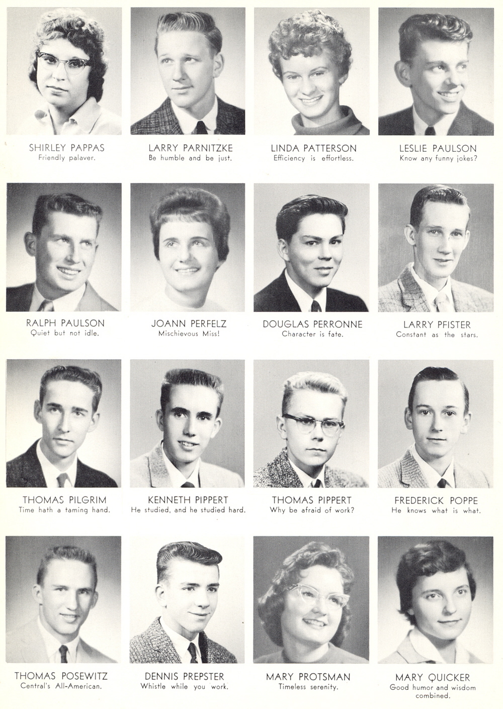 1960 Sheboygan Central High School, Page 40: Shirley Pappas, Larry Parnitzke, Linda Patterson, Leslie Paulson, Ralph Paulson, Joann Perfelz, Douglas Perronne, Larry Pfister, Thomas Pilgrim, Kenneth Pippert, Thomas Pippert, Frederick Poppe, Thomas Posewitz, Dennis Prepster, Mary Protsman, Mary Quicker.