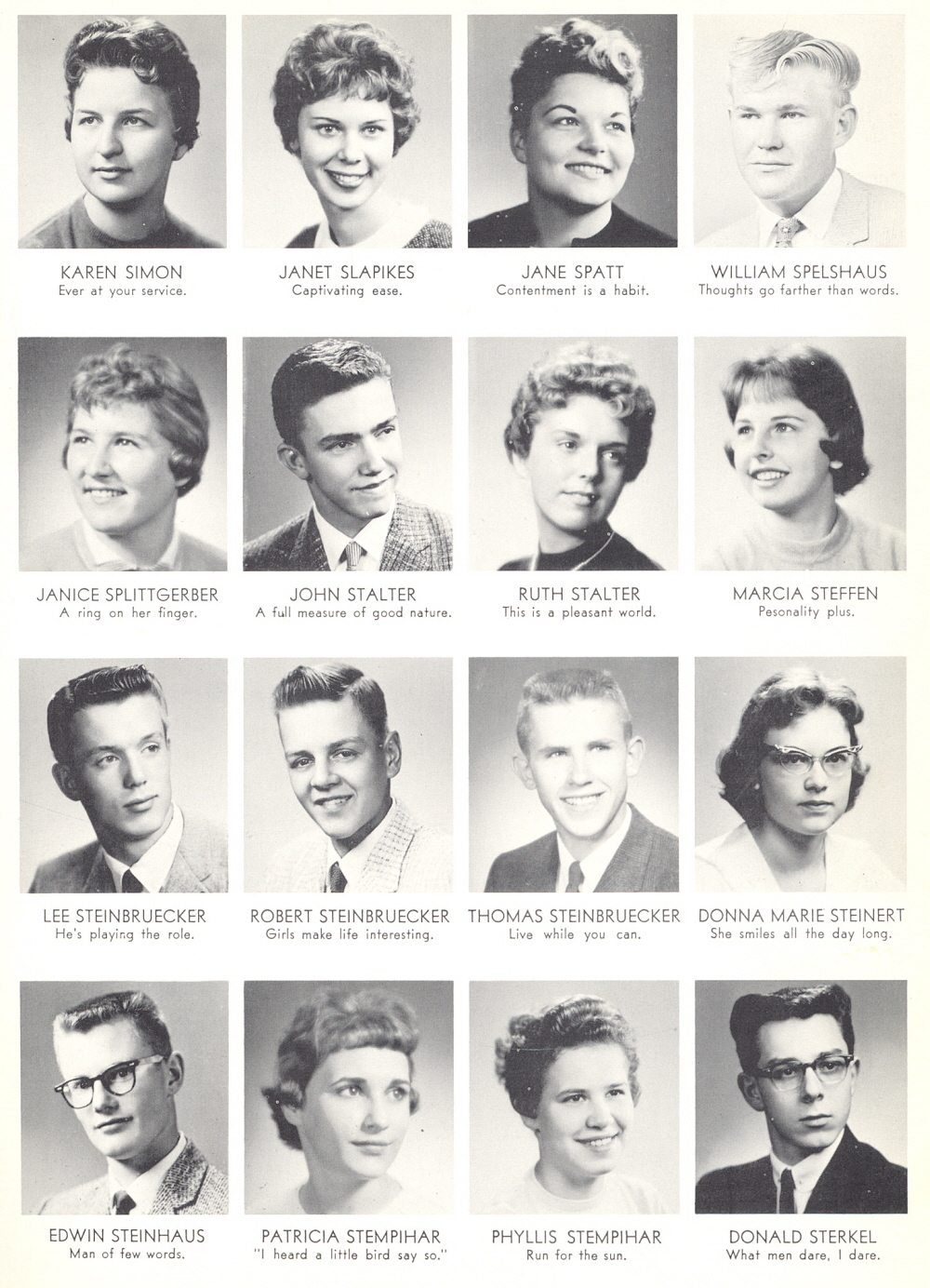 1960 Sheboygan Central High School, Page 45: Karen Simon, Janet Slapikes, Jane Spatt, William Spelshaus, Janice Splittgerber, John Stalter, Ruth Stalter, Marcia Steffen, Lee Steinbruecker, Robert Steinbruecker, Thomas Steinbruecker, Donna Steinert, Edwin Steinhaus, Patricia Stempihar, Phyllis Stempihar, Donald Sterkelz.