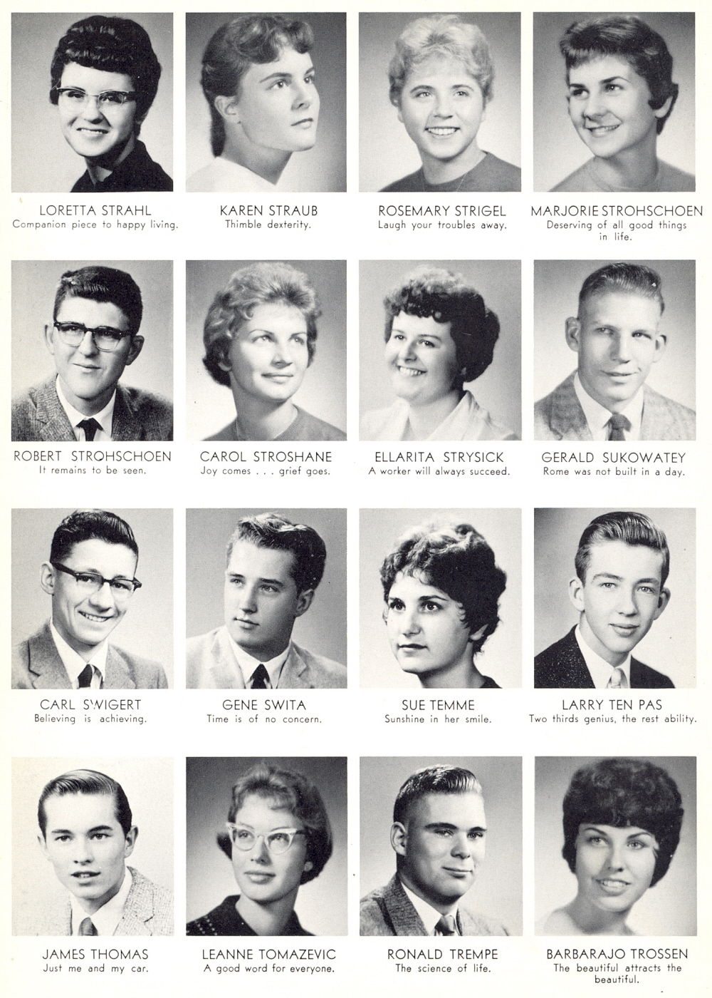 1960 Sheboygan Central High School, Page 46: Loretta Strahl, Karen Straub, Rosemary Strigel, Marjorie Strohschoen, Robert Strohschoen, Carol Stroshane, Ellarita Strysick, Gerald Sukowatey, Carol Swigert, Gene Swita, Sue Temme, Larry Ten Pas, James Thomas, Leanne Tomazevic, Ronald Trempe, Barbarajo Trossen.