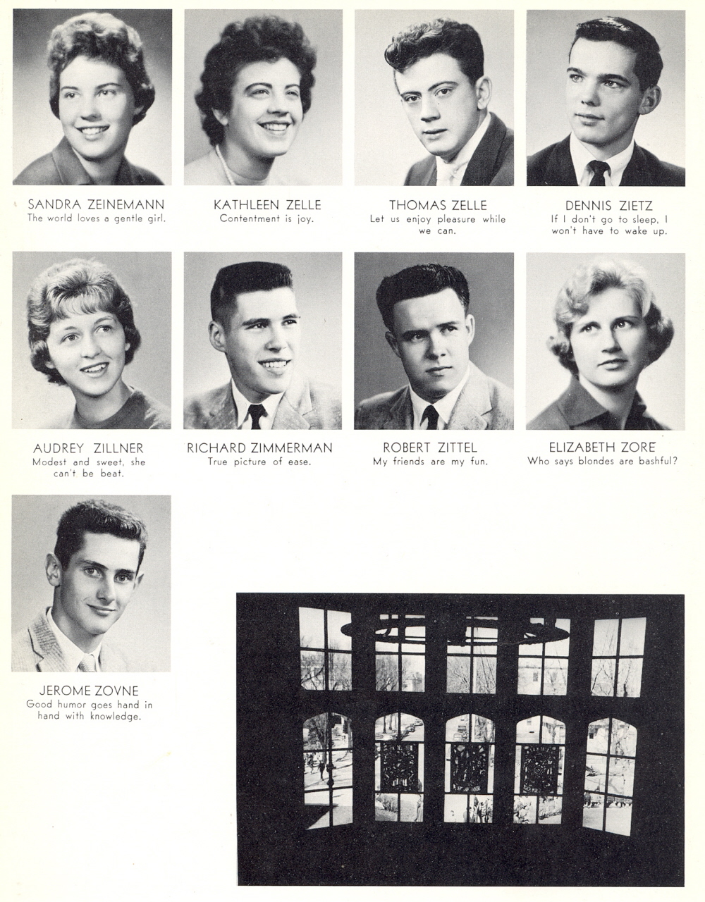1960 Sheboygan Central High School, Page 50: Sandra Zeinemann, Kathleen Zelle, Thomas Zelle, Dennis Zietz, Audrey Zillner, Richard Zimmerman, Robert Zittel, Elizabeth Zore, Jerome Zovne.
