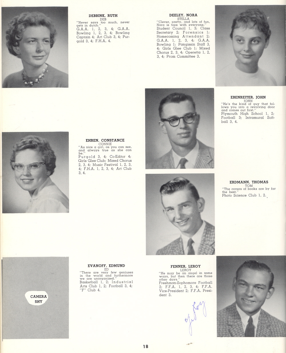 1960 Sheboygan Falls High School, Page 18: Ruth Debbink, Nora Deeley, John Ebenreiter, Constance Ehren, Thomas Erdmann, Edmund Evanoff, Leroy Fenner.