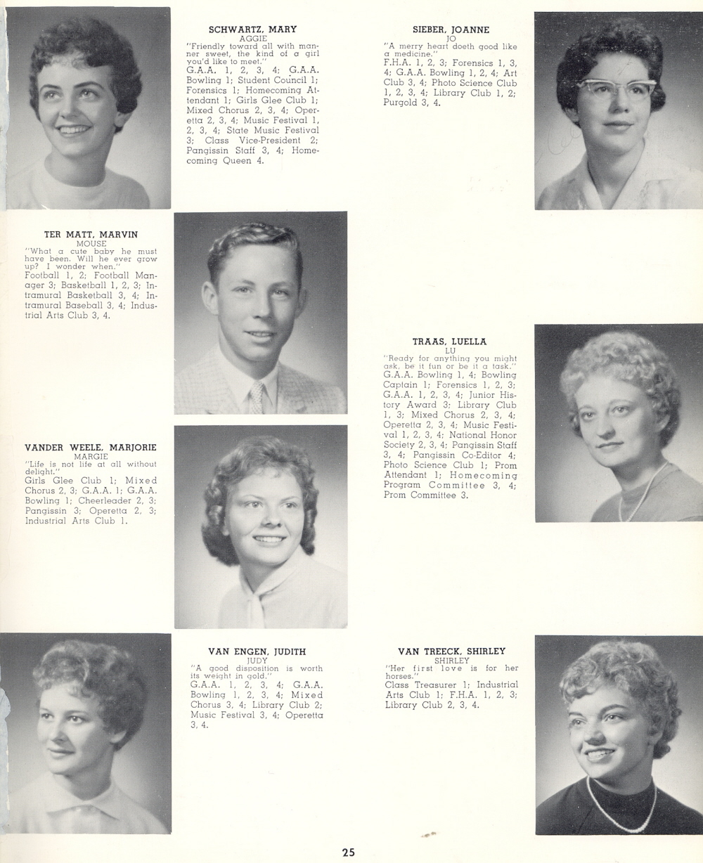 1960 Sheboygan Falls High School, Page 25: Mary Schwartz, Joanne Sieber, Marvin Ter Matt, Luella Traas, Marjorie Vander Weele, Judith Van Engen, Shirley Van Treeck.