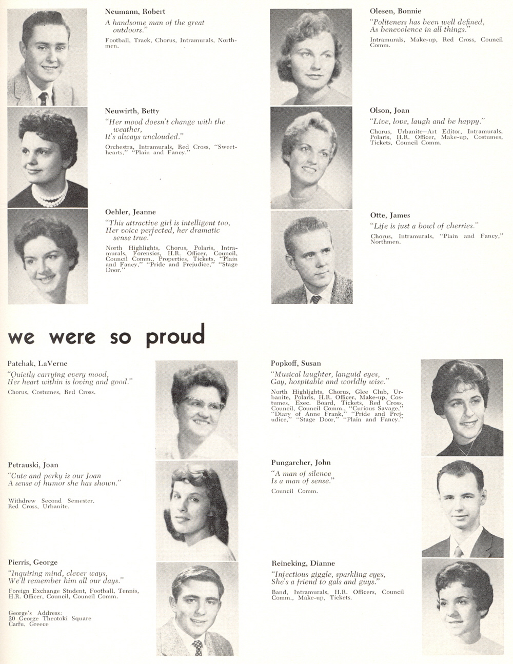 1960 Sheboygan North High School, Page 31: Robert Neumann, Betty Neuwirth, Jeanne Oehler, Bonnie Olesen, Joan Olson, James Otte, LaVerne Patchak, Joan Petrauski, George Pierris, Susan Popkoff, John Pungarcher, Dianne Reineking.