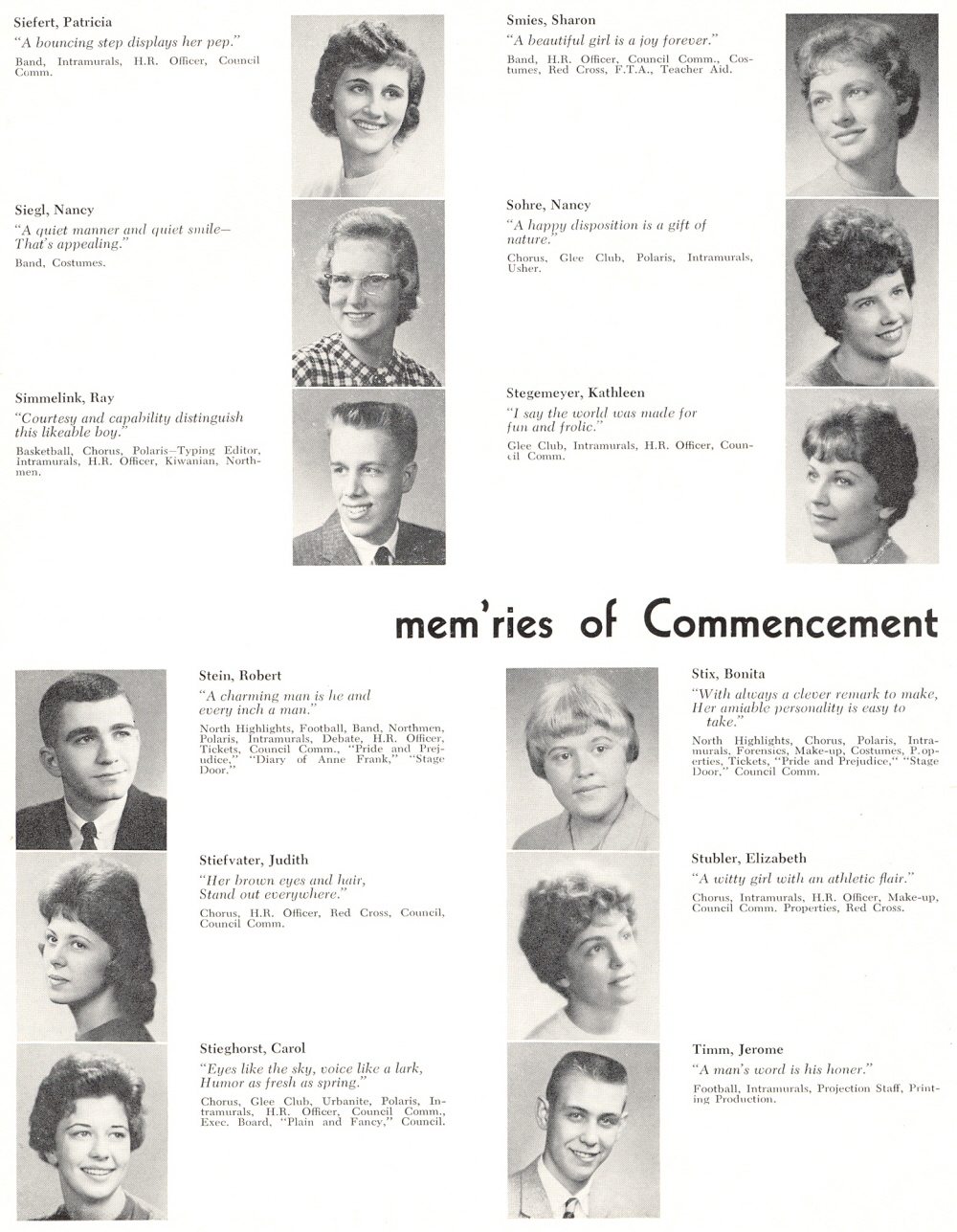 1960 Sheboygan North High School, Page 34: Patricia Siefert, Nancy Siegl, Ray Simmelink, Sharon Smies, Nancy Sohre, Kathleen Stegemeyer, Robert Stein, Judith Stiefvater, Carol Stieghorst, Bonita Stix, Elizabeth Stubler, Jerome Timm.
