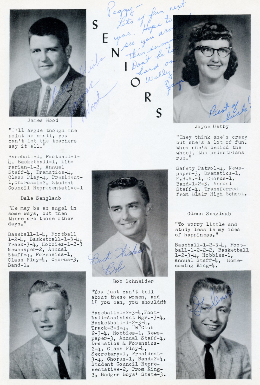 1960 Waldo High School Yearbook Page 6: James Wood, Joyce Ustby, Bob Senglaub, Glenn Senglaub, Bob Schneider.