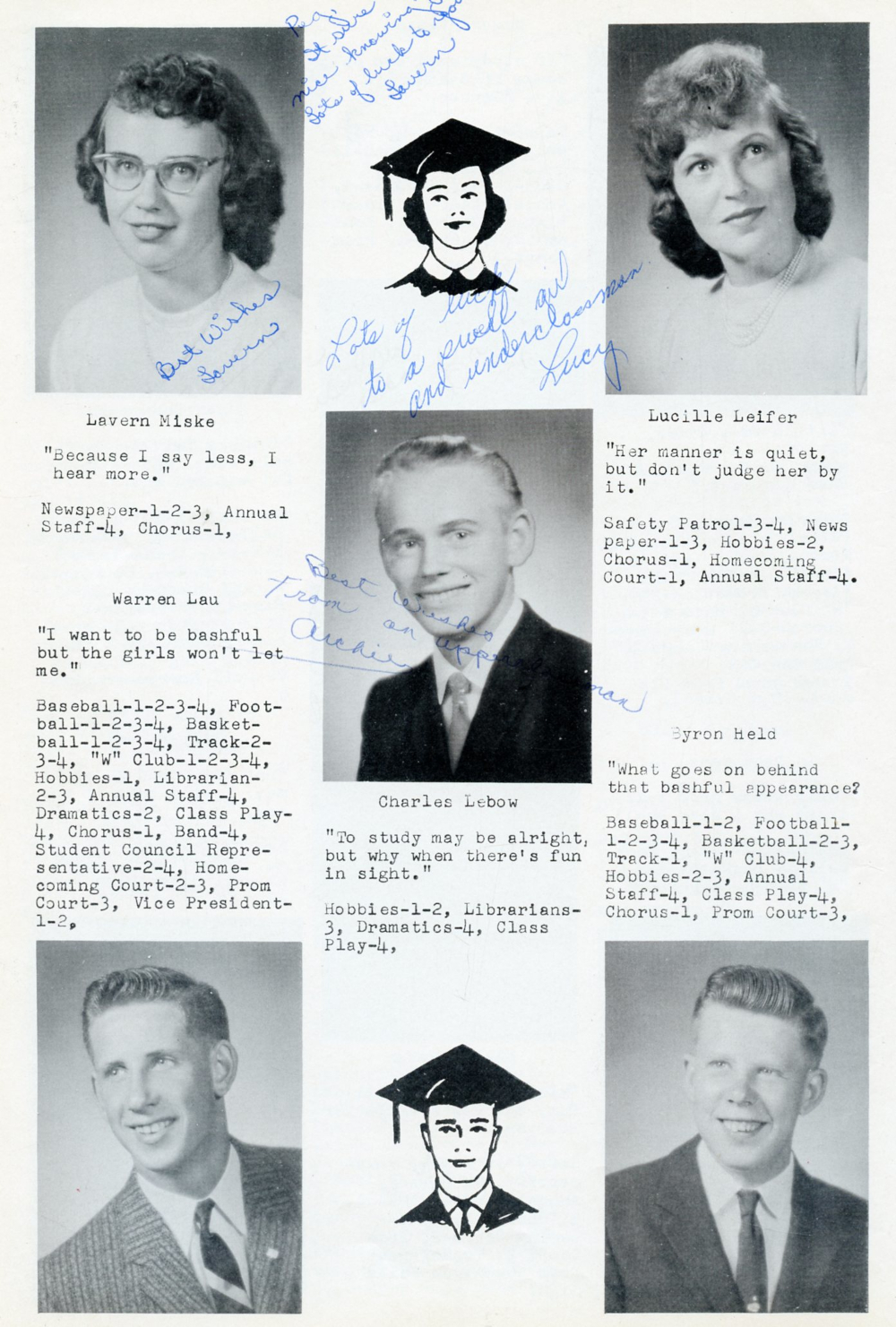1960 Waldo High School Yearbook Page 8: Lavern Miske, Lucille Leifer, Charles Lebow, Warren Lau, Byron Held.