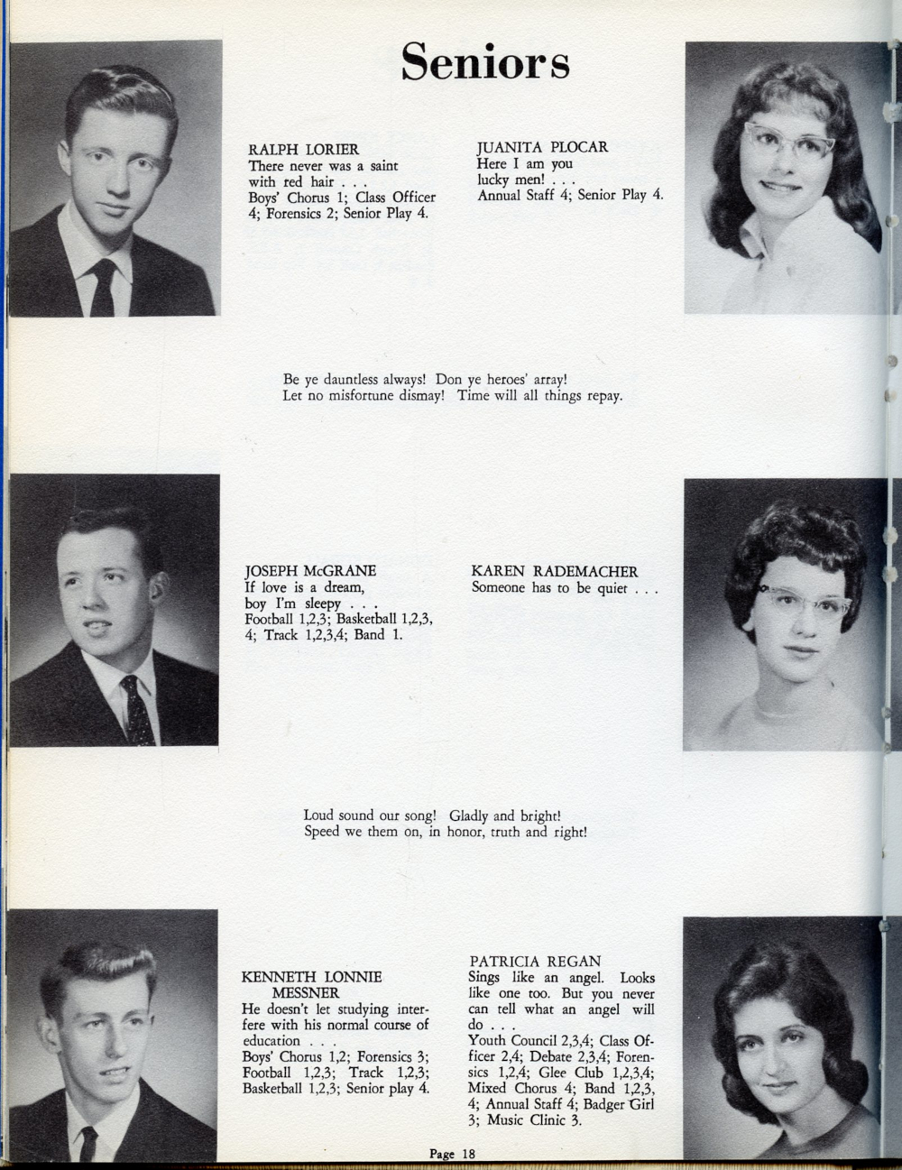 1961 Kohler High School Yearbook Page 18: Ralph Lorier, Joseph McGrane, Kenneth Lonnie Messner, Juanita Plocar, Karen Rademacher, Patricia Regan.