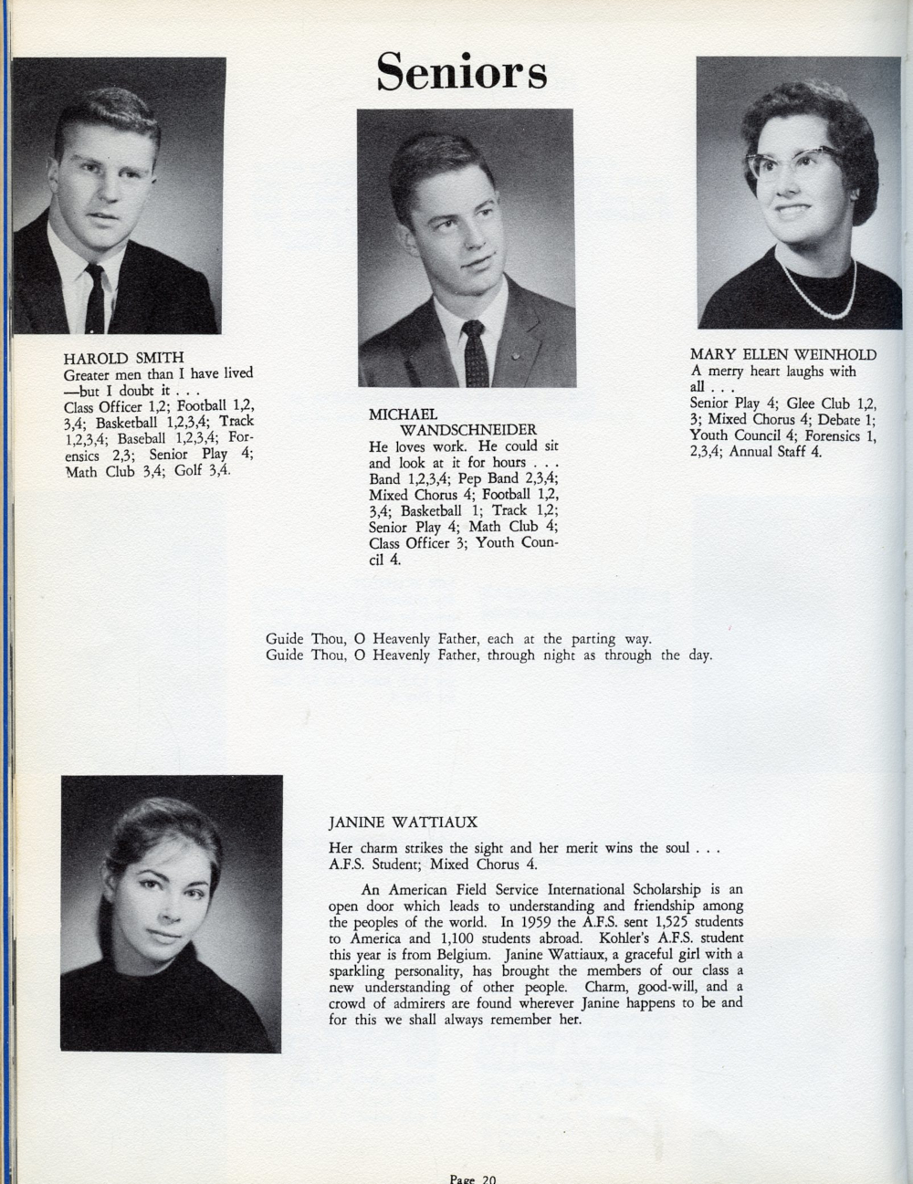 1961 Kohler High School Yearbook Page 20: Harold Smith, Michael Wandschneider, Mary Ellen Weinhold, Janine Wattiaux.