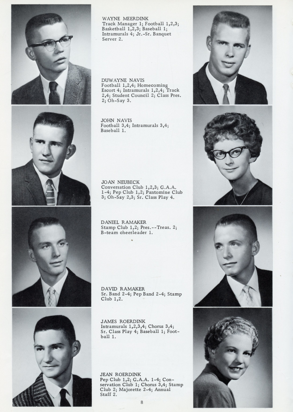 1961 Oostburg High School Yearbook Page 8: Wayne Meerdink, Duwayne Navis, John Navis, Joan Neubeck, Daniel Ramaker, David Ramaker, James Roerdink, Jean Roerdink.