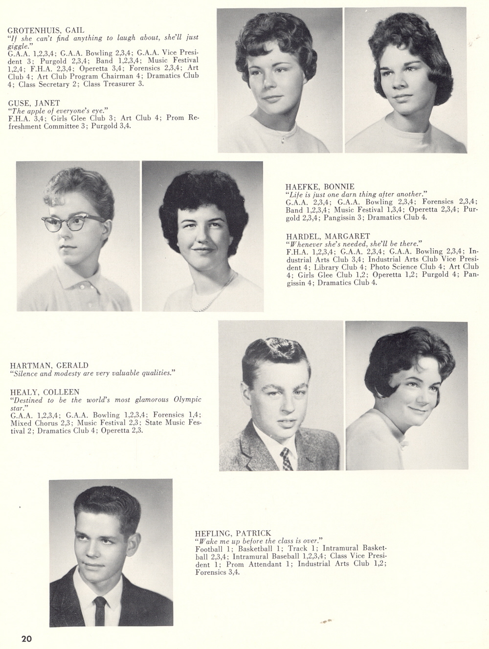 1961 Sheboygan Falls High School, Page 20: Gail Grotenhuis, Janet Guse, Bonnie Haefke, Margaret Hardel, Gerald Hartman, Colleen Healy, Patrick Hefling.