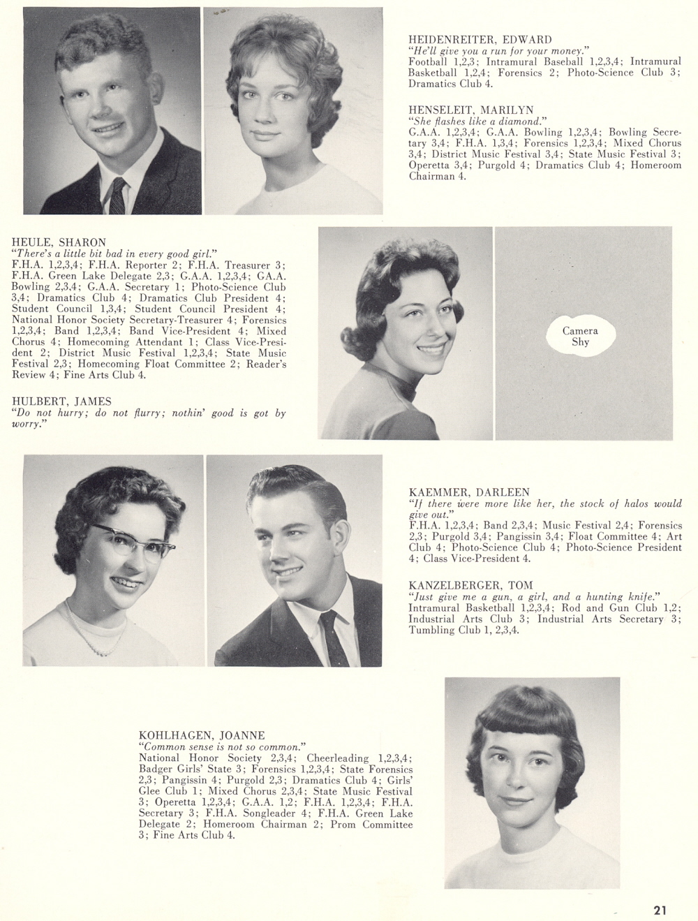 1961 Sheboygan Falls High School, Page 21: Edward Heidenreiter, Marilyn Henseleit, Sharon Heule, James Hulbert, Darleen Kaemmer, Tom Kanzelberger, Joanne Kohlhagen.