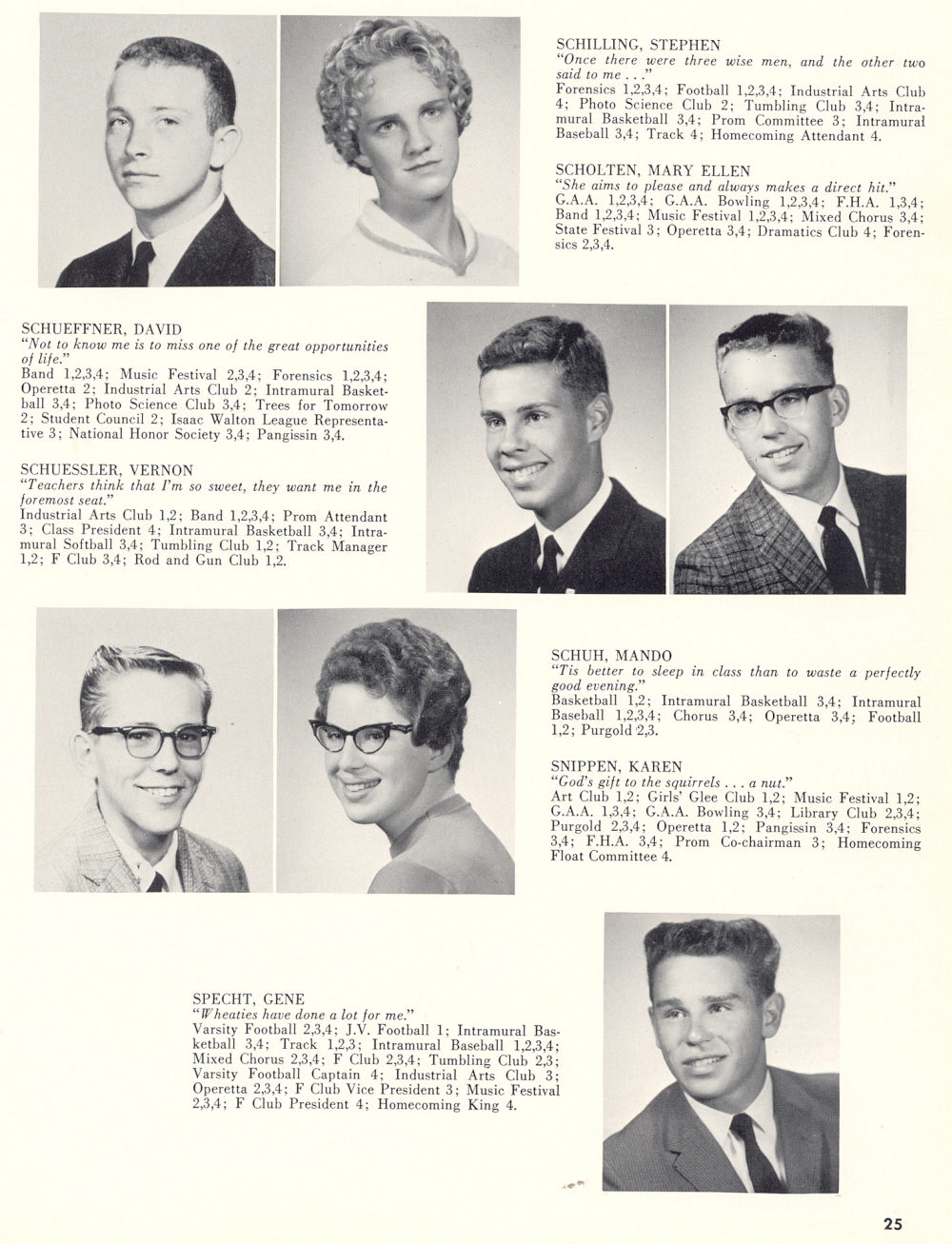 1961 Sheboygan Falls High School, Page 25: Stephen Schilling, Mary Ellen Scholten, David Schueffner, Vernon Schuessler, Mando Schuh, Karen Snippen, Gene Specht.