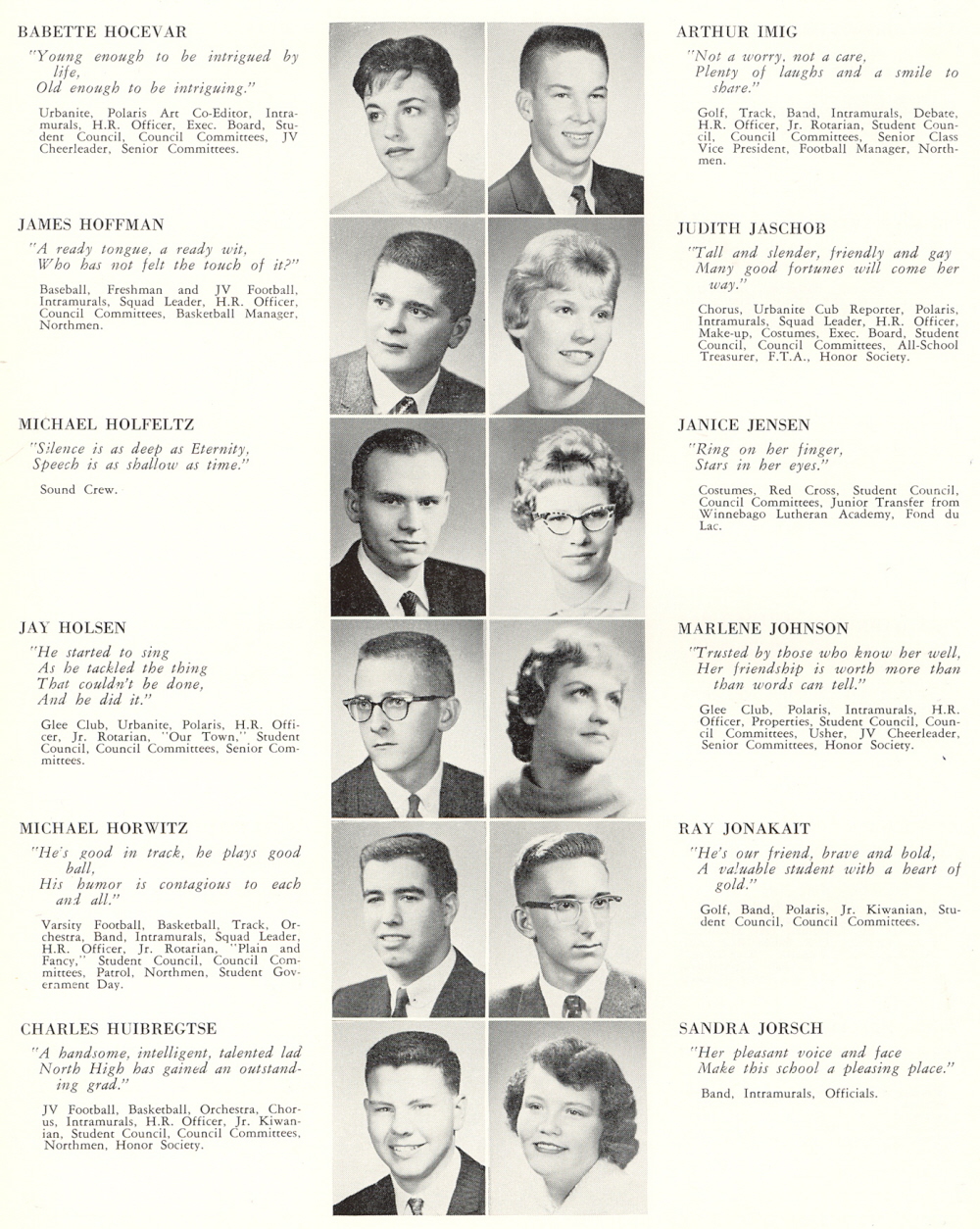 1961 Sheboygan North High School, Page 100: Babette Hocevar, James Hoffman, Michael Holfeltz, Jay Holsen, Michael Horwitz, Charles Huibregtse, Arthur Imig, Judith Jaschob, Janice Jensen, Marlene Johnson, Ray Jonakait, Sandra Jorsch.