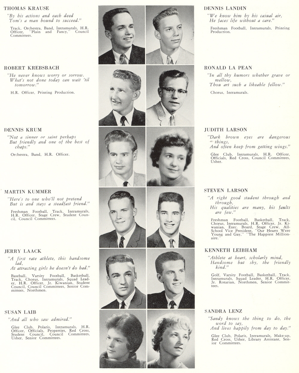 1961 Sheboygan North High School, Page 103: Thomas Krause, Robert Krebsbach, Dennis Krum, Martin Kummer, Jerry Laack, Susan Laib, Dennis Landin, Ronald La Pean, Judith Larson, Steven Larson, Kenneth Leibham, Sandra Lenz.
