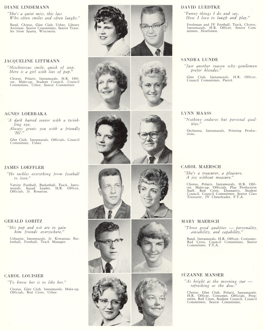 1961 Sheboygan North High School, Page 104: Diane Lindemann, Jacqueline Littmann, Agnes Loebbaka, James Leffler, Gerald Loritz, Carol Louisier, David Luedtke, Sandra Lunde, Lynn Maass, Carol Maersch, Mary Maersch, Suzanne Manser.
