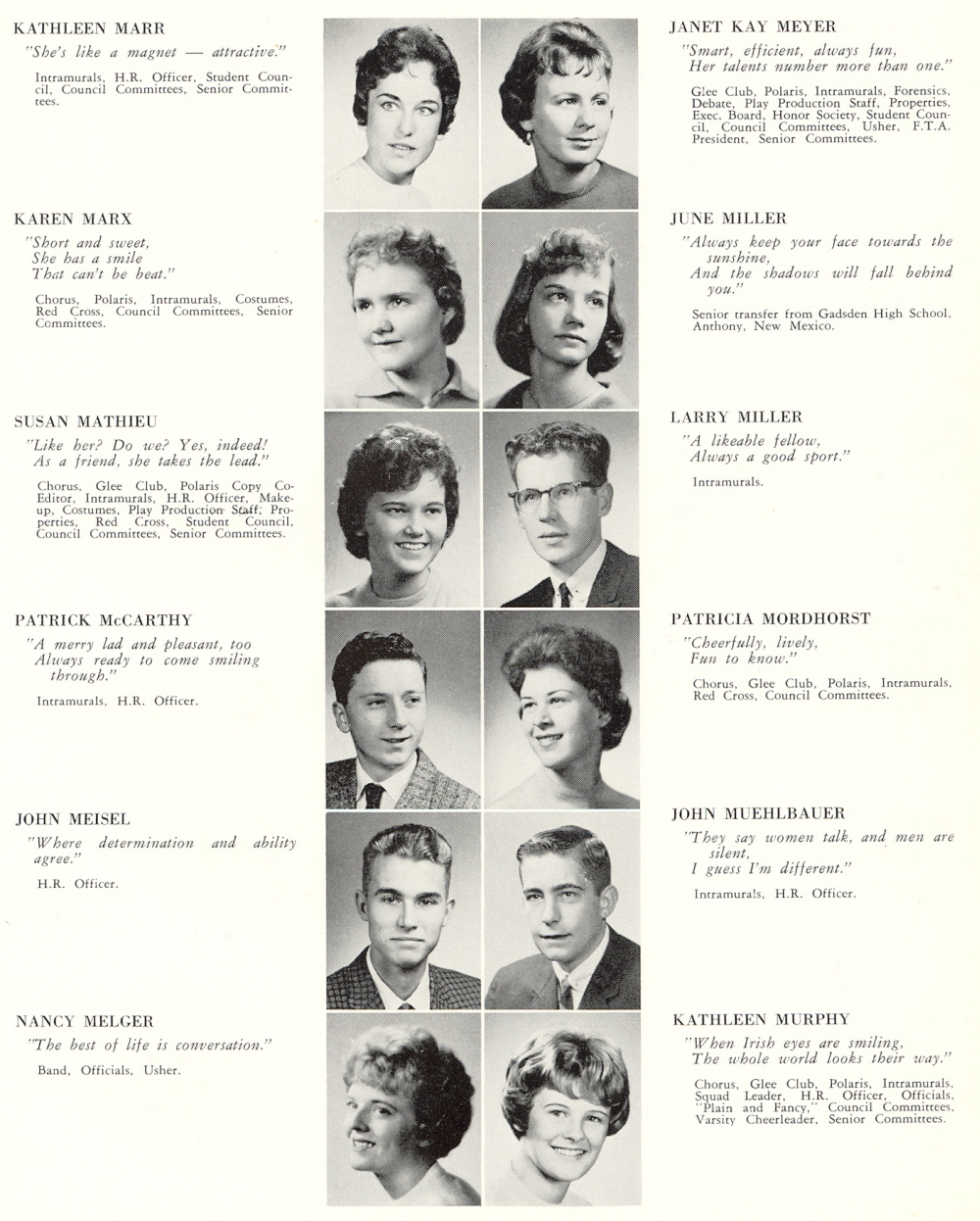 1961 Sheboygan North High School, Page 105: Kathleen Marr, Karen Marx, Susan Mathieu, Patrick McCarthy, John Meisel, Nancy Melger, Janet Kay Meyer, June Miller, Larry Miller, Patricia Mordhorst, John Muehlbauer, Kathleen Murphy.