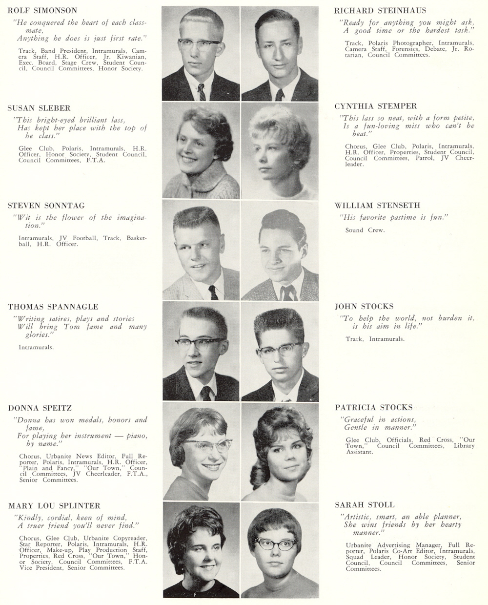 1961 Sheboygan North High School, Page 111: Rolf Simonson, Susan Sleber, Steven Sonntag, Thomas Spannagle, Donna Speitz, Mary Lou Splinter, Richard Steinhaus, Cynthia Stemper, William Stenseth, John Stocks, Patricia Stocks, Sarah Stoll.