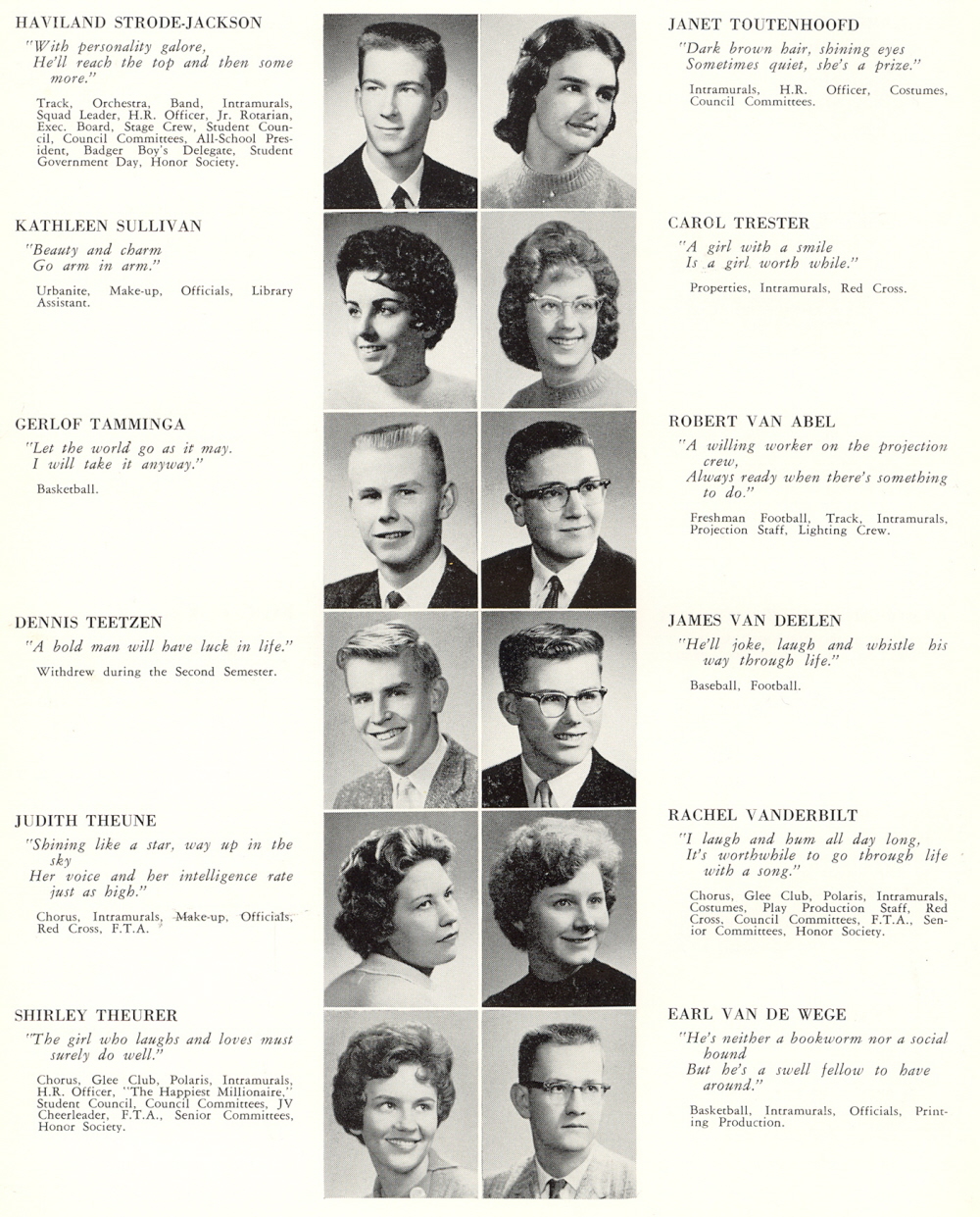 High School, Page 112: Haviland Strode-Jackson, Kathleen Sullivan, Gerlof Tamminga, Dennis Teetzen, Judith Theune, Shirley Theurer, Janet Toutenhoofd, Carol Trester, Robert Van Abel, James Van Deelen, Rachel Vanderbilt, Earl Van De Wege.