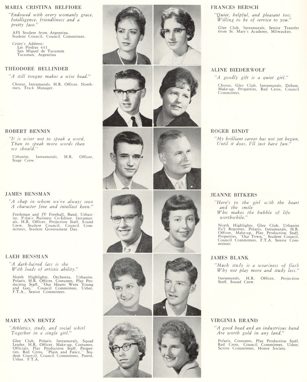 1961 Sheboygan North High School, Page 94: Maria Christina Belfiore, Theodore Bellinder, Robert Bennin, James Bensman, Laeh Bensman, Mary Ann Bentz, Frances Bersch, Aline Biederwolf, Roger Bindt, Jeanne Bitkers, James Blank, Virginia Brand.