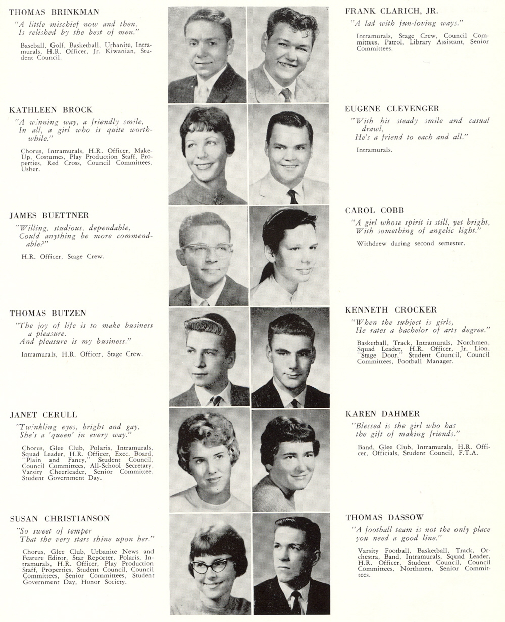 1961 Sheboygan North High School, Page 95: Thomas Brinkman, Kathleen Brock, James Buettner, Thomas Butzen, Janet Cerull, Susan Christianson, Frank Clarick, Jr., Eugene Clevenger, Carol Cobb, Kenneth Crocker, Karen Dahmer, Thomas Dassow.