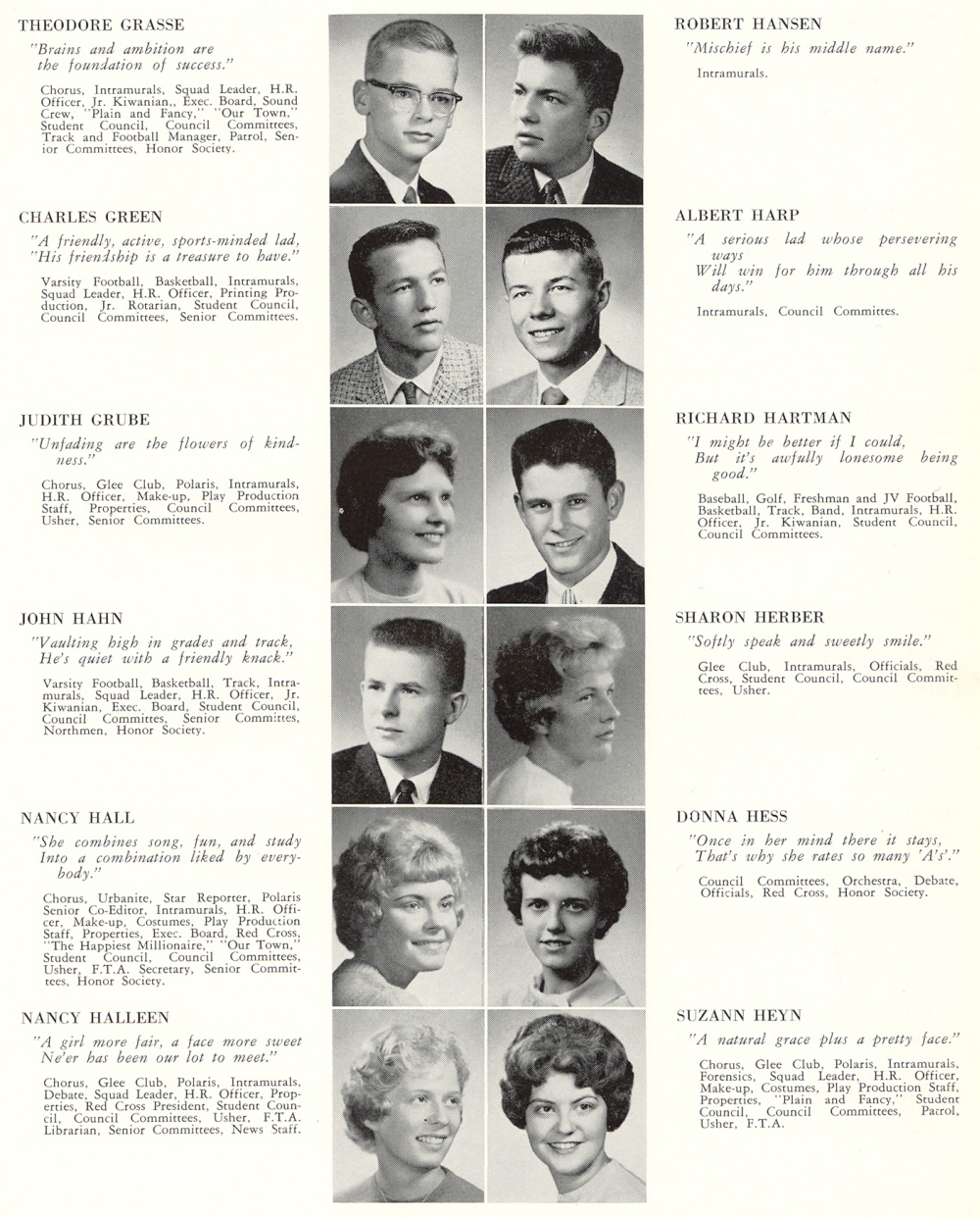 1961 Sheboygan North High School, Page 99: Theodore Grasse, Charles Green, Judith Grube, John Hahn, Nancy Hall, Nancy Halleen, Robert Hansen, Albert Harp, Richard Hartman, Sharon Herber, Donna Hess, Suzann Heyn.
