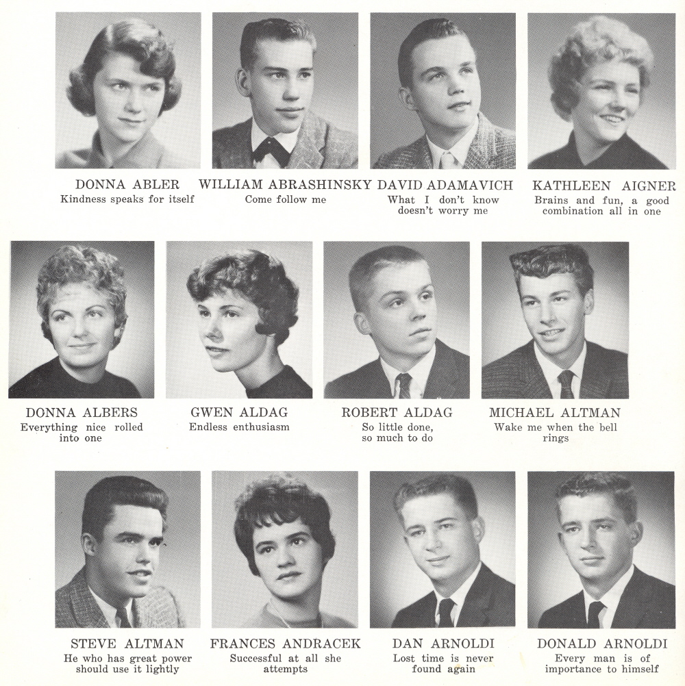 1961 Sheboygan South High School, Page 28: Donna Abler, William Abrashinsky, David Adamavich, Kathleen Aigner, Donna Albers, Gwen Aldag, Robert Aldag, Michael Altman, Steve Altman, Frances Andracek, Dan Arnoldi, Donald Arnoldi.
