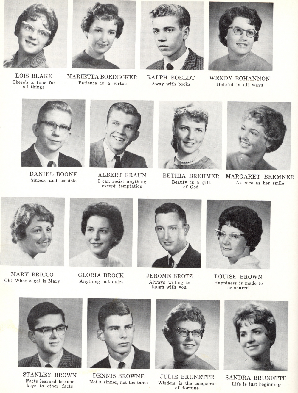 1961 Sheboygan South High School, Page 30: Lois Blake, Marietta Boedecker, Ralph Boeldt, Wendy Bohannon, Daniel Boone, Albert Braun, Bethia Brehmer, Margaret Bremner, Mary Bricco, Gloria Brock, Jerome Brotz, Louise Brown, Stanley Brown, Dennis Browne, Julie Brunette, Sandra Brunette.