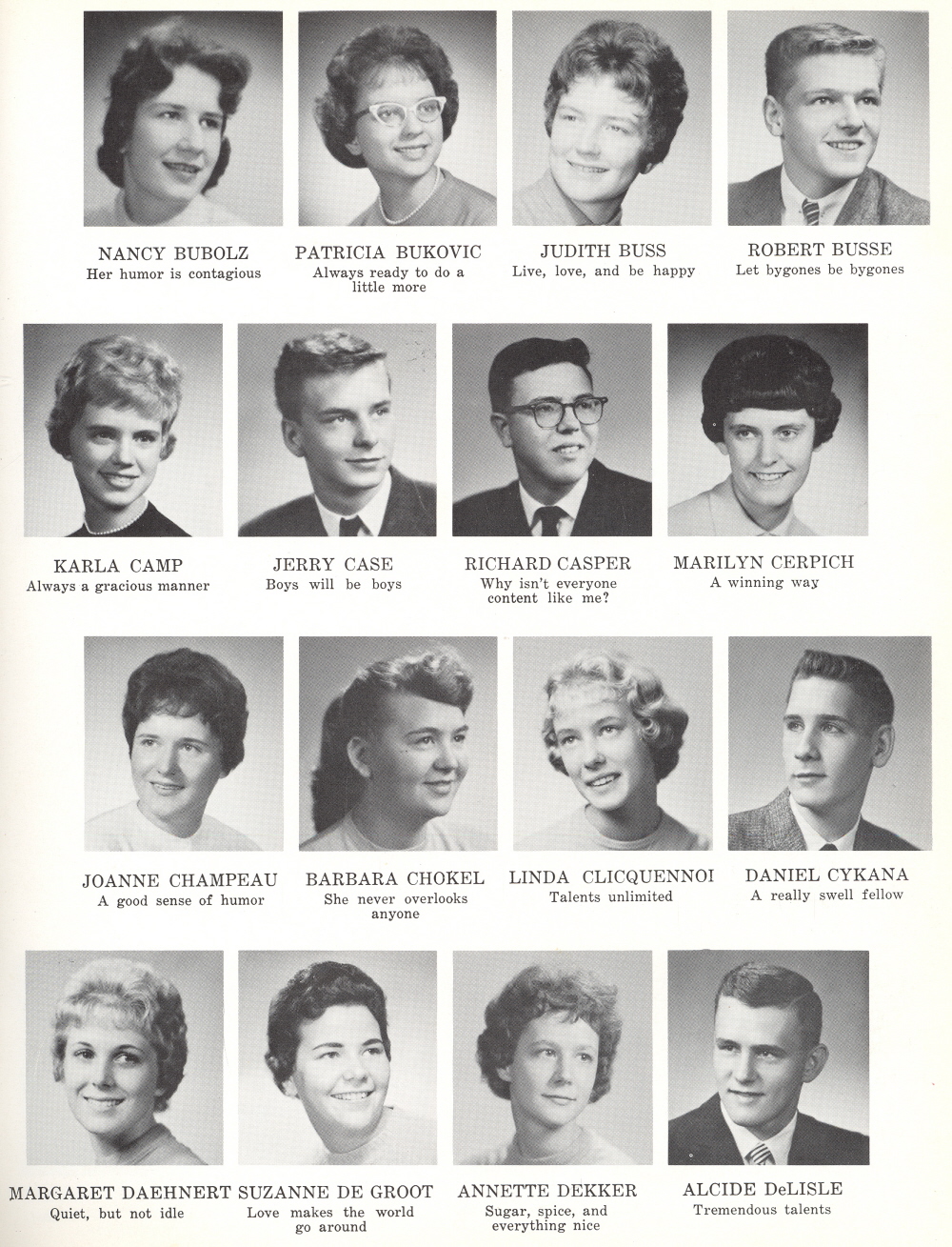 1961 Sheboygan South High School, Page 31: Nancy Bubolz, Patricia Bukovic, Judith Buss, Robert Busse, Karla Camp, Jerry Case, Richard Casper, Marilyn Cerpich, Joanne Champeau, Barbara Chokel, Linda Clicquennoi, Daniel Cykana, Margaret Daehnert, Suzanne De Groot, Annette Dekker, Alcide DeLisle.