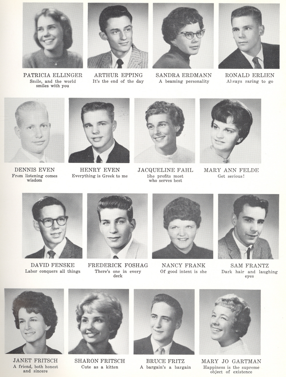 1961 Sheboygan South High School, Page 33: Patricia Ellinger, Arthur Epping, Sandra Erdmann, Ronald Erlein, Dennis Even, Henry Even, Jacqueline Fahl, Mary Ann Felde, David Fenske, Frederick Foshag, Nancy Frank, Sam Frantz, Janet Fritsch, Sharon Fritsch, Bruce Fritz, Mary Jo Gartman.
