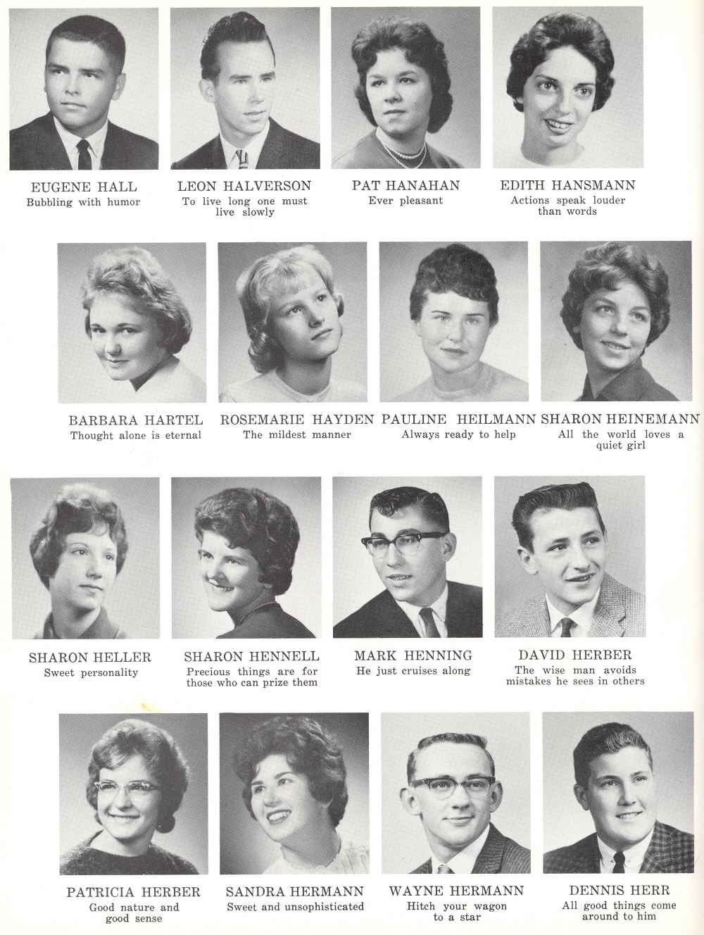 1961 Sheboygan South High School, Page 36: Eugene Hall, Leon Halverson, Pat Hanahan, Edith Hansmann, Barbara Hartel, Rosemarie Hayden, Pauline Heilmann, Sharon Heinemann, Sharon Heller, Sharon Hennell, Mark Henning, David Herber, Patricia Herber, Sandra Hermann, Wayne Hermann, Dennis Herr.