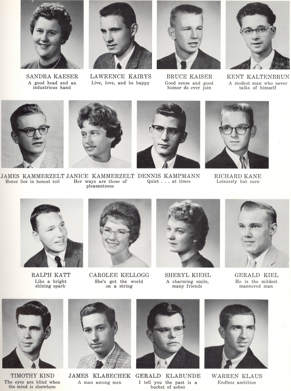 1961 Sheboygan South High School, Page 39: Sandra Kaeser, Lawrence Kairys, Bruce Kaiser, Kent Kaltenbrun, James Kammerzelt, Janice Kammerzelt, Dennis Kampmann, Richard Kane, Ralph Katt, Carolee Kellogg, Sheryl Kiehl, Gerald Kiel, Timothy Kind, James Klabechek, Gerald Klabunde, Warren Klaus.