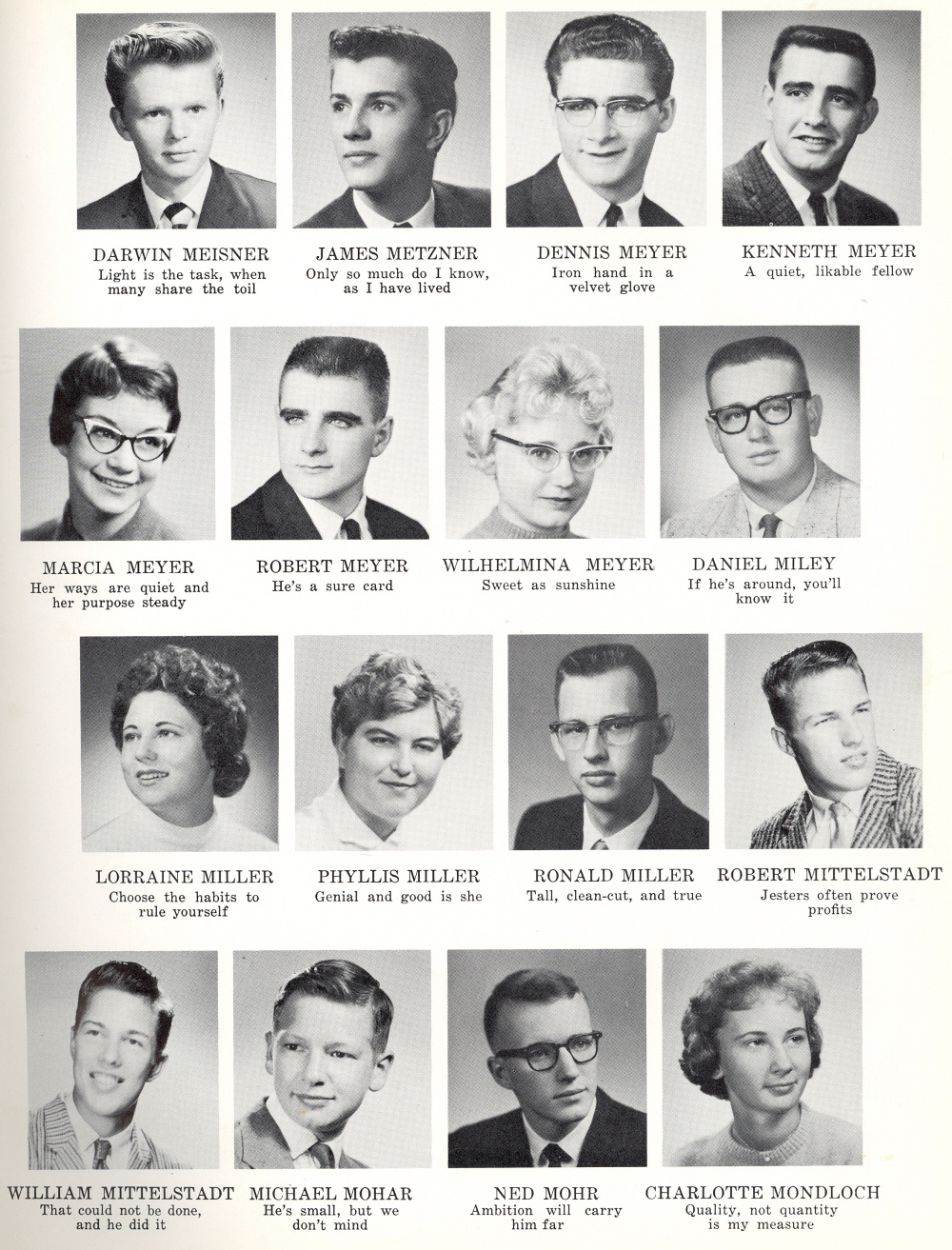1961 Sheboygan South High School, Page 43: Darwin Meisner, James Metzner, Dennis Meyer, Kenneth Meyer, Marcia Meyer, Robert Meyer, Wilhelmina Meyer, Daniel Miley, Lorraine Miller, Phyllis Miller, Ronald Miller, Robert Mittelstadt, William Mittelstadt, Michael Mohar, Ned Mohr, Charlotte Mondloch.