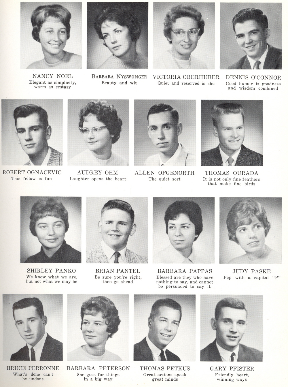 1961 Sheboygan South High School, Page 45: Nancy Noel, Barbara Nyswonger, Victoria Oberhuber, Dennis O'Connor, Robert Ognacevic, Audrey Ohm, Allen Opgenorth, Thomas Ourada, Shirley Panko, Brian Pantel, Barbara Pappas, Judy Paske, Bruce Perronne, Barbara Peterson, Thomas Petkus, Gary Pfister.