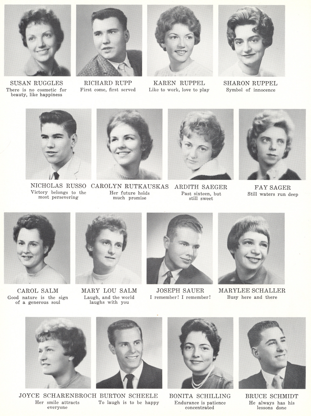 1961 Sheboygan South High School, Page 48: Susan Ruggles, Richard Rupp, Karen Ruppel, Sharon Ruppel, Nicholas Russo, Carolyn Rutkauskas, Ardith Saeger, Fay Sager, Carol Salm, Mary Lou Salm, Joseph Sauer, Marylee Schaller, Joyce Scharenbroch, Burton Scheele, Bonita Schilling, Bruce Schmidt.