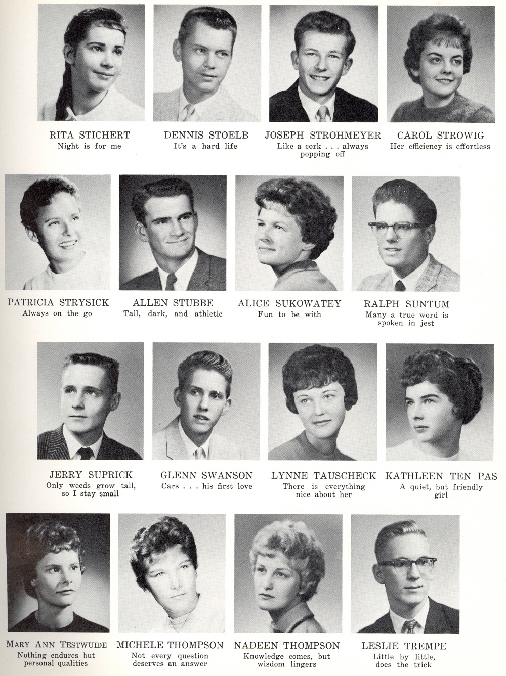 1961 Sheboygan South High School, Page 51: Rita Stichert, Dennis Stoelb, Joseph Strohmeyer, Carol Strowig, Patricia Strysick, Allen Stubbe, Alice Sukowatey, Ralph Suntum, Jerry Subrick, Glenn Swanson, Lynne Tauscheck, Kathleen Ten Pas, Mary Ann Testwuide, Michele Thompson, Nadeen Thompson, Leslie Trempe.